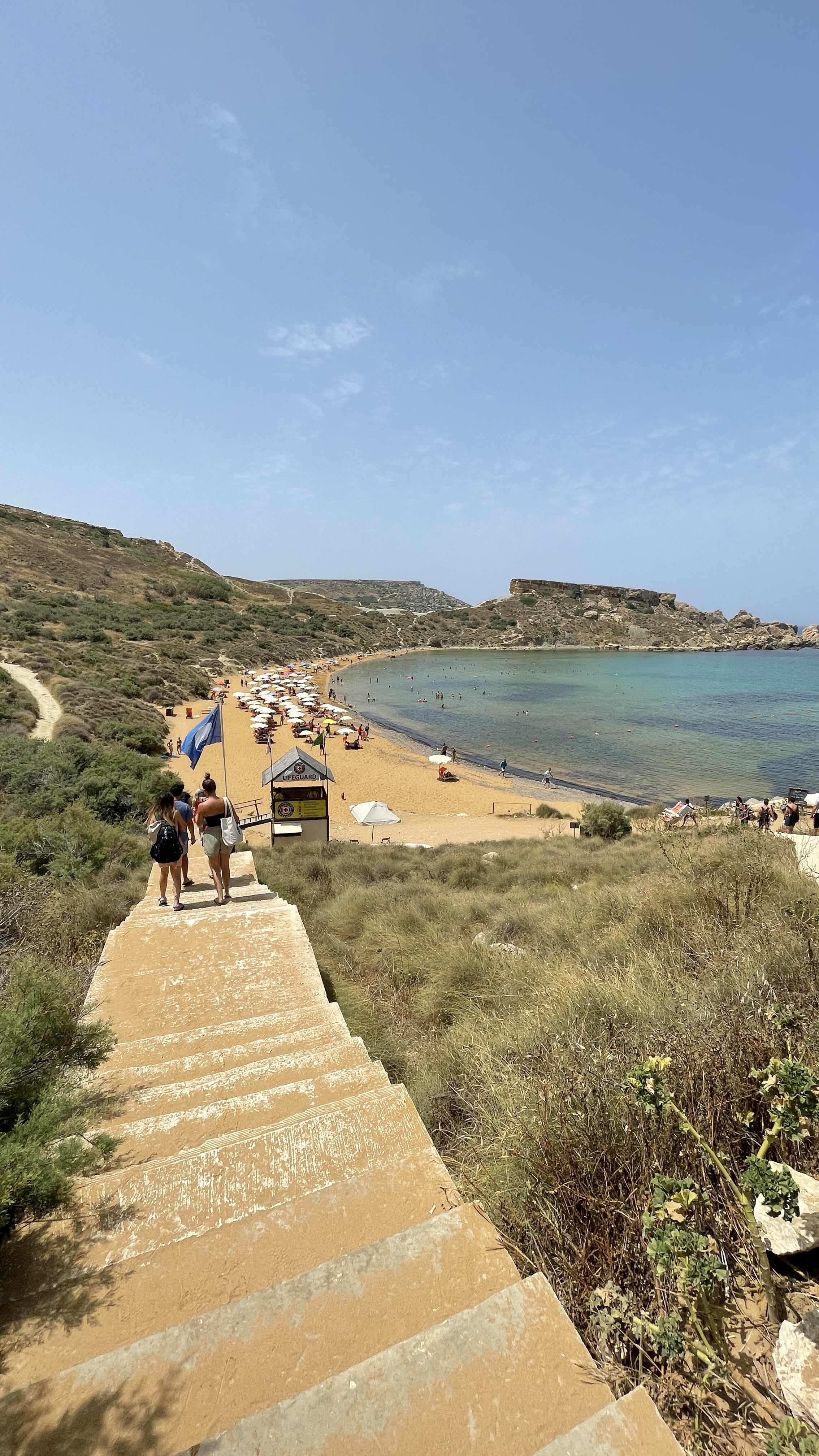 Vyliezli sme teda na najbližší kopec s vežou. Cesta nám trvala mierne dlhšie ale tie fotošútingy za to stoja. Boli odtiaľ naozaj krásne výhľady na obe pláže, preto nám nevadilo tam chvíľu pobudnúť a kochať sa výhľadom. Pláž Għajn Tuffieħa bay – je prístupná iba po zdolaní 200 schodov. Pravdepodobne aj vďaka tomuto faktu si nebol problém nájsť miesto na opaľovanie. Obe pláže boli piesočnaté s pozvoľným vstupom. Na tejto však boli bójky o kus bližšie tak sme sa vydali na cestu k nim. Boli sme udivený aká číra bola tá voda. Stále sme mali možnosť vidieť na dno. Bolo to nádherné. Určite odporúčame nevynechať tieto miesta ak budete na Malte.