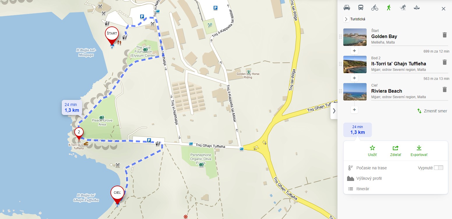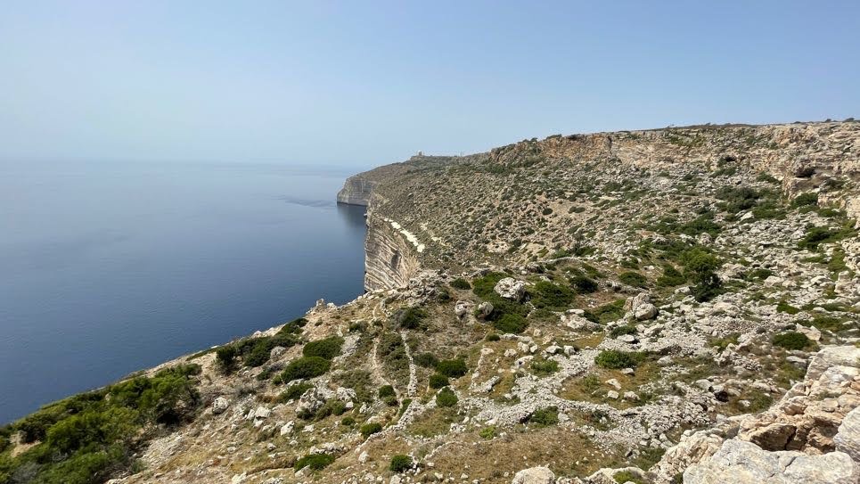 Ďalšie miesto – Dingli Cliffs sme našli na IG ako veľmi pekné miesto na fotku a celkovo výhľad. Nepozreli sme si to však asi dostatočne dobre a po vystúpení z taxíku sme vôbec nevideli ten pekný sľubovaný výhľad. Nevzdali sme sa však a po krátkom googlení sme našli presnejšiu pozíciu, na mapách označovanú ako – Dingli Cliffs Window. Boli sme vzdialení od tohto miesta taký slabý kilometer ako som to nazval (1.6 km). Chvíľami to vyzeralo, že teplo porazí motiváciu pekného výhľadu, no 35 °C slnečno a bezvetrie nás nezlomilo. Fotky boli výborné.