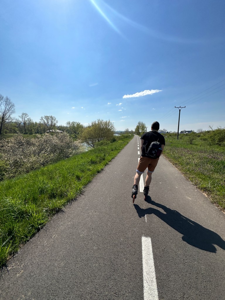 Deň sme začali omšou a hneď potom išli na vlak. Na stanici v Piešťanoch sme sa prezuli do korčúľ. Predtým sme si pozreli kadiaľ sa dostaneme na cyklotrasu, ktorá ide popri Váhu. Za asi 15 minút sme sa tam dostali a odtiaľ sme už išli len rovno. Bolo tam veľmi krásne. Ticho prerušovala len príroda. Po asi 45 minútach sme sa otočili a vybrali sa spať aby sme stihli vlak. Celkovo sme prešli 25 km. 😅