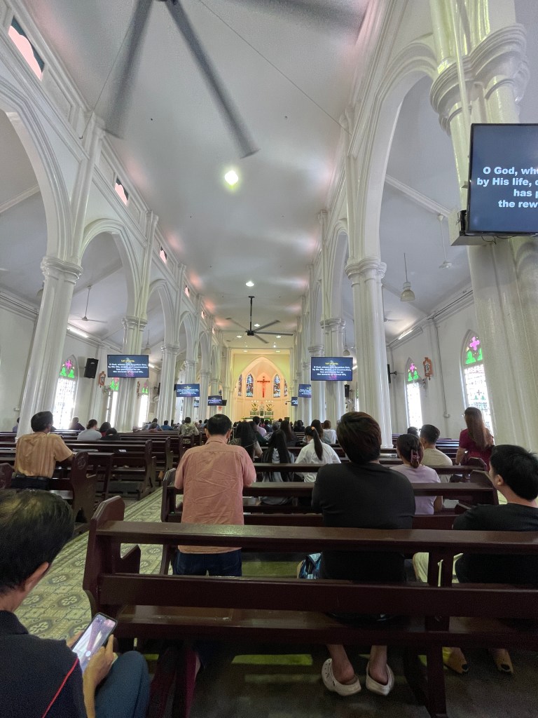 Na omšu sme išli pešo asi 30 minút. Kostol bol pekný a aj celkom veľký. Keď sme prišli k vchodu po stranách stali ľudia s červenými šerpami. Najprv sme si mysleli, že budú mať birmovku ale nakoniec sme zistili že títo ľudia uvádzali veriacich v kostole. Bol to pekný zážitok byť v Ázii na omši a sme radi, že sme tam boli.