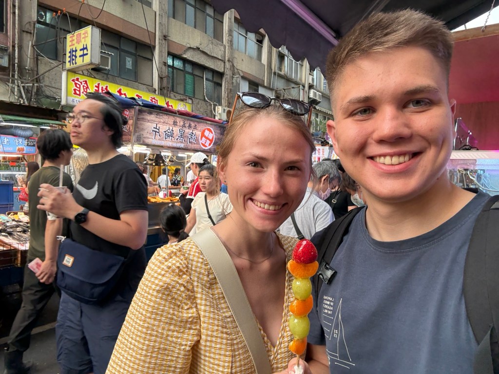 Po neskoršom obede sme išli pozrieť jeden z nočných marketov – Raohe Night Market. Bol celkom dlhý a bolo tam toho veľmi veľa,rôzne druhy jedla ale ajvšetkého ostatného.. Market býva otvorený od 17 do polnoci. Vyskúšali sme viacero špecialít. Michelinské mochi, ovocie v karameli – Tanghulu, zmrzlinu v placke s arašidmi a takú buchtu s mäsom a zeleninou. Sladké veci boli veľmi fajn ale mäso v buchte bolo tak zvláštne okorenené. Okrem rôznych chutí bolo na markete citit aj veľa vôní, ktoré pre nás boli dosť silné. Ale bol to zážitok. Veľa sme videli a dalo sa tam aj veľa poskúšať.