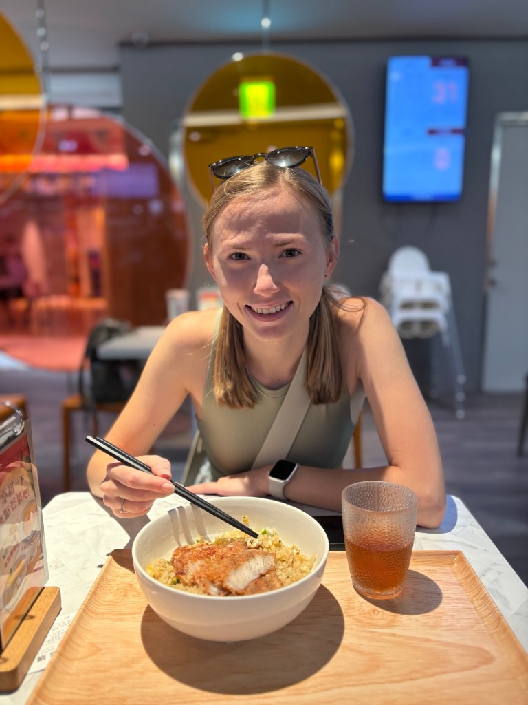 Po omši sme sa vrátili na metro a objavili sme Metro Mall – podzemné nákupné centrum dlhé niekoľko kilometrov. Počas nášho pobytu na Taiwane sa nám viackrát stalo, že sme niečo nevedeli nájsť, no nakoniec sme na to vždy narazili. 😅 Hneď na začiatku centra sme objavili skvelú reštauráciu s praženou ryžou a bravčovým mäsom. Za mňa (Hanku) čistých 10/10 – trochu viac pikantné, ale veľmi chutné.