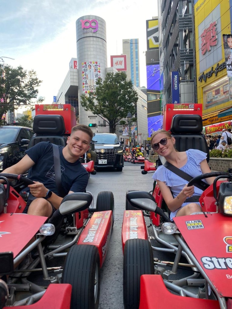 Popoludní nás čakalo niečo špeciálne – jazda na motokárach priamo po uliciach Tokya. Tieto motokáry si môžete prenajať na hodinu a ak chcete, v ponuke sú aj rôzne kostýmy. My sme to tentokrát vynechali, pretože bolo veľmi teplo. Dôležitou podmienkou je mať medzinárodný vodičák, ktorý si treba vybaviť ešte doma – platí rok. V Tokyu je viacero trás, my sme si vybrali okruh cez Shibuyu. Vyrazili sme navečer, keď boli ulice plné ľudí. Bola to obrovská sranda – síce drahšia atrakcia, no určite stojí za to. 😁