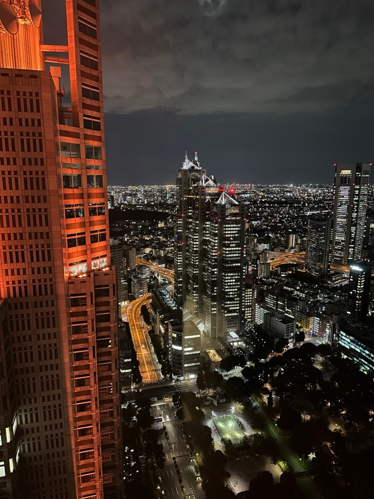 Večer sme sa presunuli do oblasti Shinjuku, kde sa nachádza vládna budova. Dá sa tu ísť na vyhliadku úplne zadarmo, a my sme mali šťastie – akurát prebiehala špeciálna Light Show, pri ktorej každú pol hodinu premietali na budovu rôzne scenérie. Trvalo to asi desať minút a stálo to za to. Hore na vyhliadke bolo viac ľudí, takže sme si chvíľu počkali na výťah, no zážitok bol skvelý. A ešte bonus – veľmi pekný suvenírový obchod s dobrými cenami.