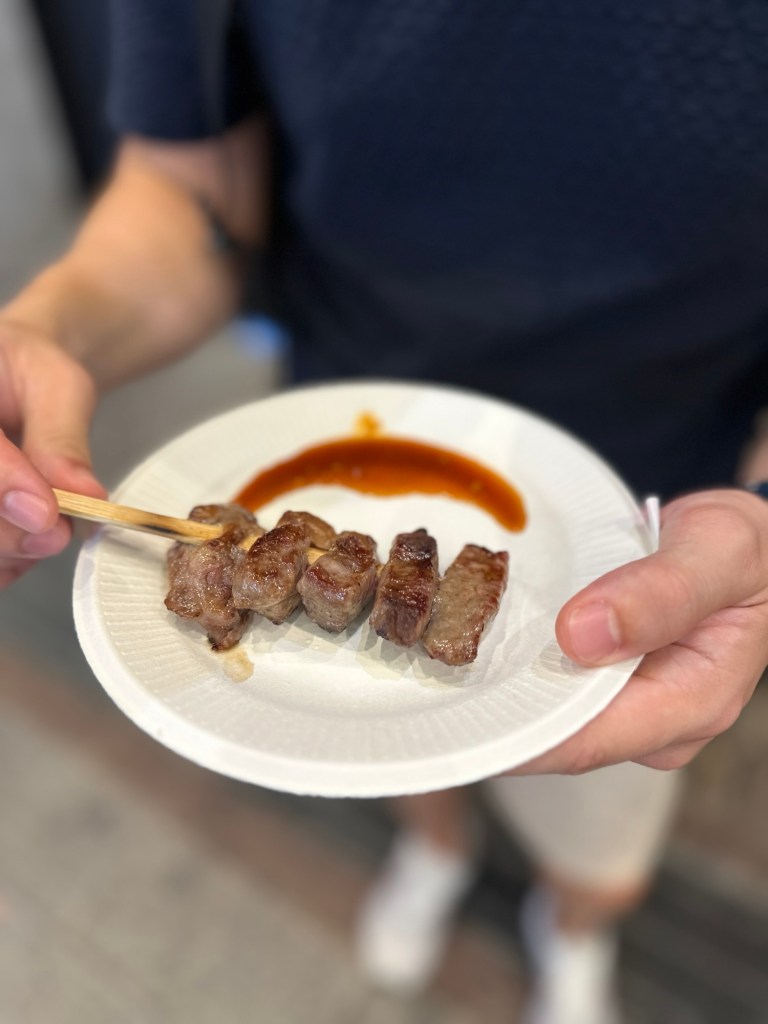 V podvečer sme sa zastavili ešte v rôznych obchodíkoch a vybrali sa znovu na Nishiki Market. Tentokrát už bol otvorený a vyskúšali sme slávne Waguu. Je to hovädzie, pochádzajúce práve z Japonska. Bolo šťavnaté a celkom chutné.